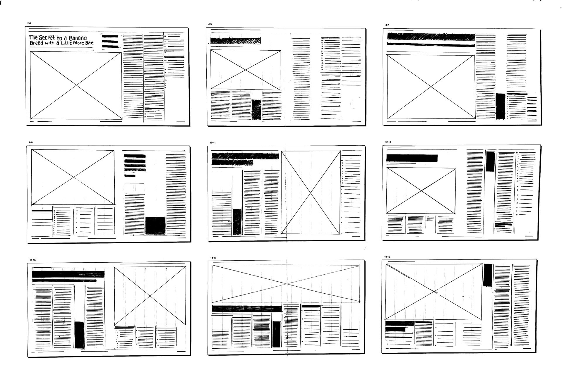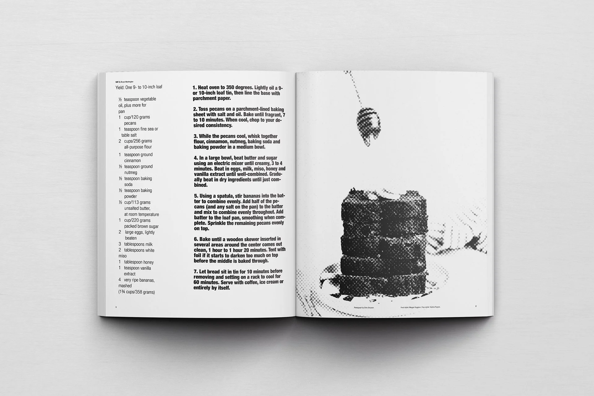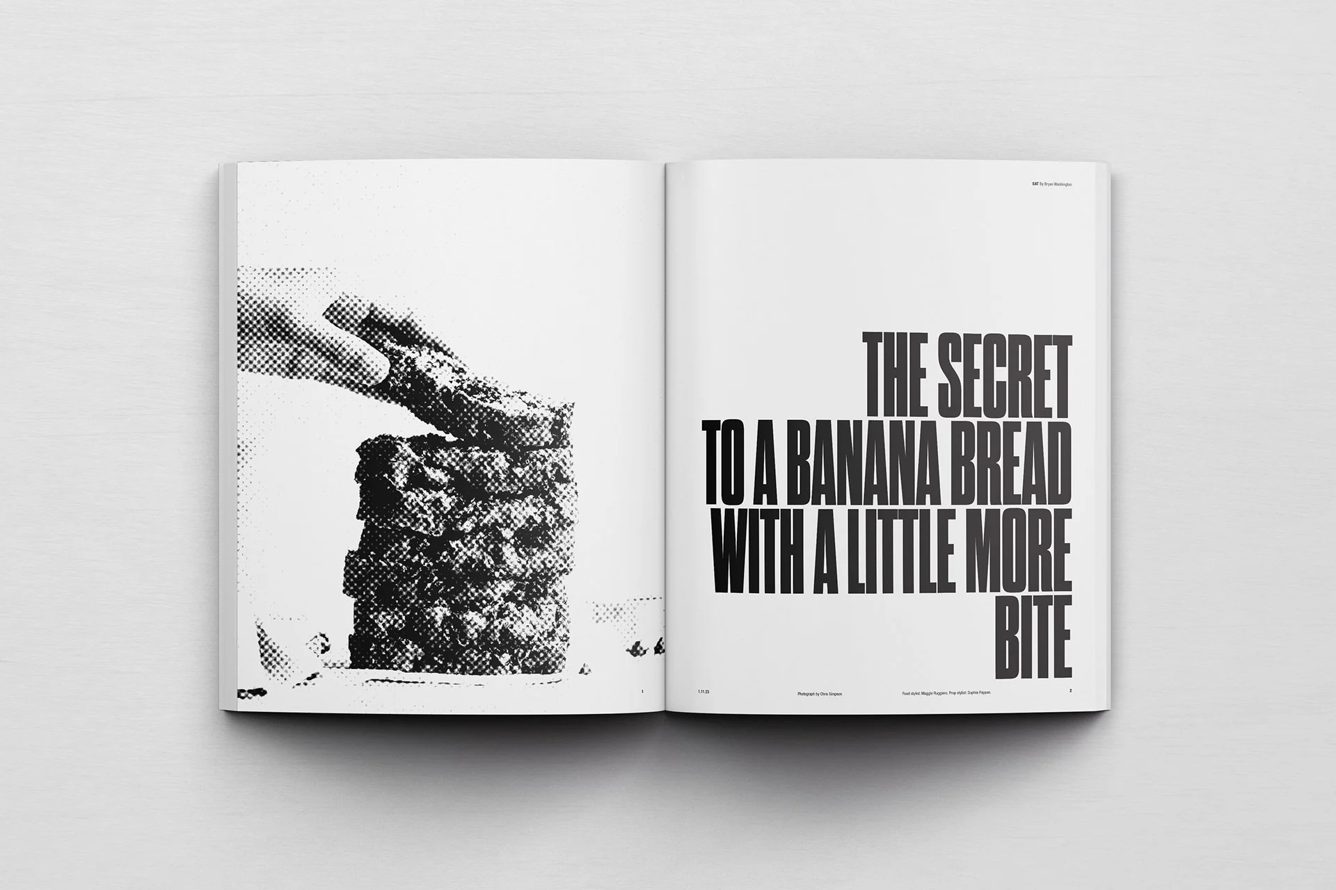 For this project, I redesigned the New York Times eat section with a selected recipe from their collection. The design is bold and minimal because the author talks about how something as simple as banana bread, can evoke such strong emotions. Subtle, yet playful moves like mimicking the stacking of banana bread with the letterforms add to the cheeky nature of this magazine.